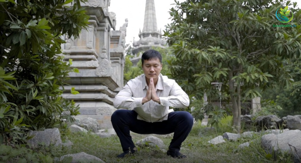 The temple squat hold originates from Buddhist meditation traditions, where monks maintained low squatting positions for extended periods.